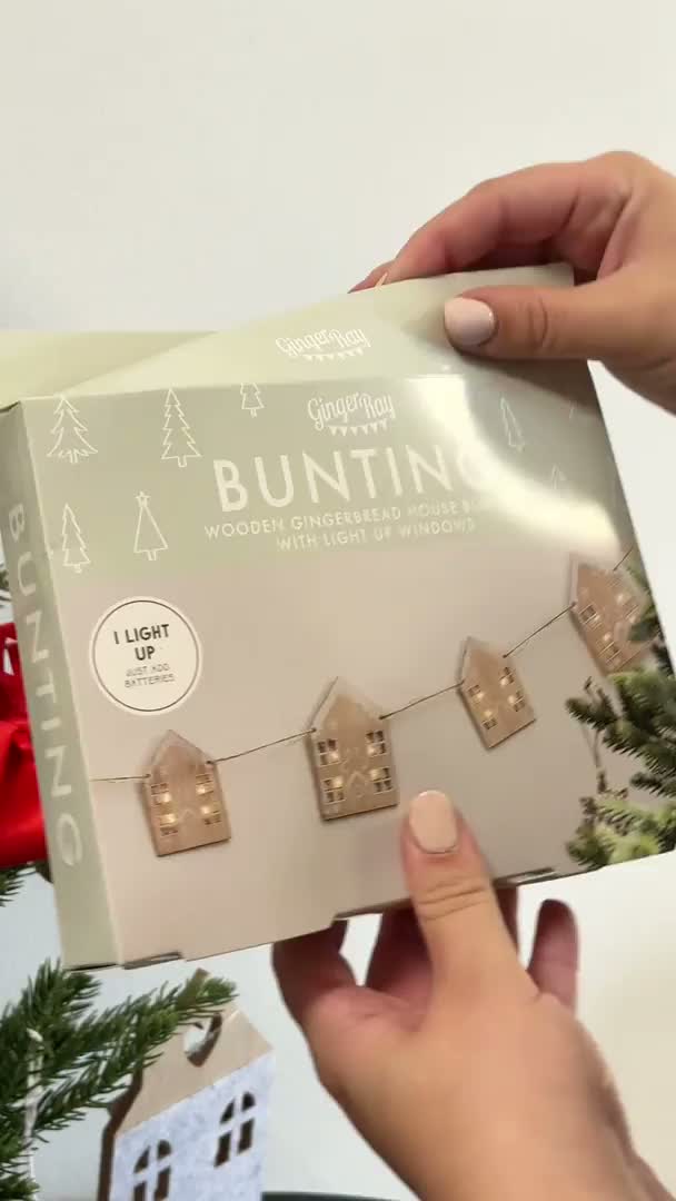 - Na girlandi je obešenih 8 kosov lesenih hišic