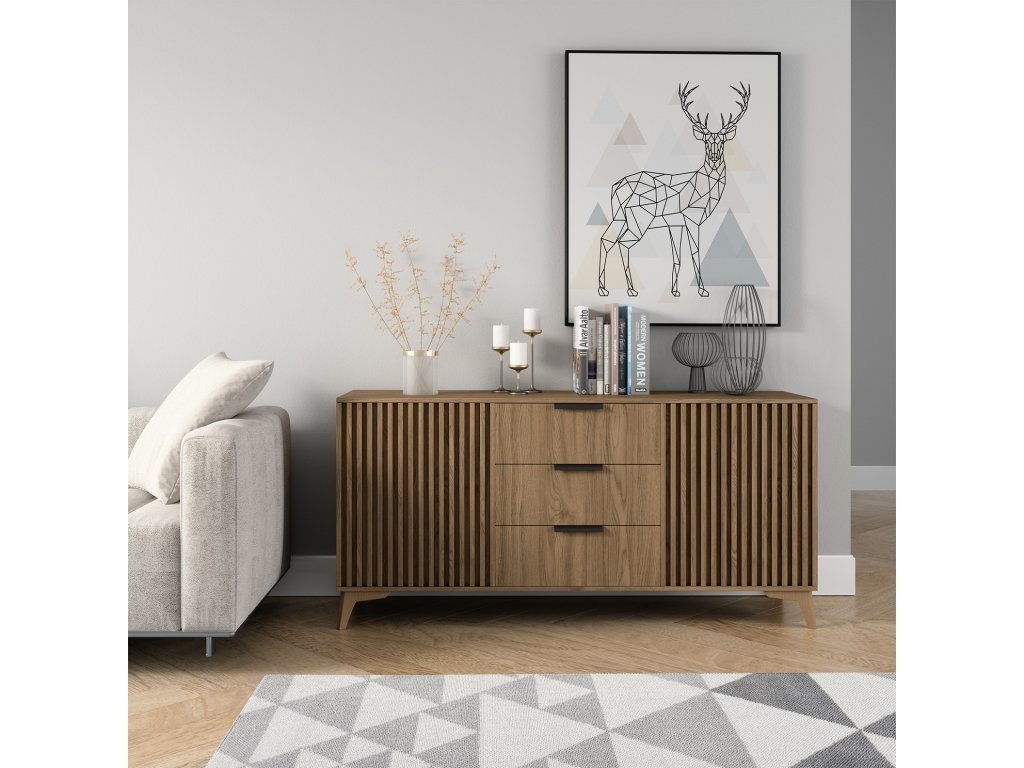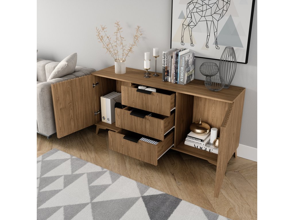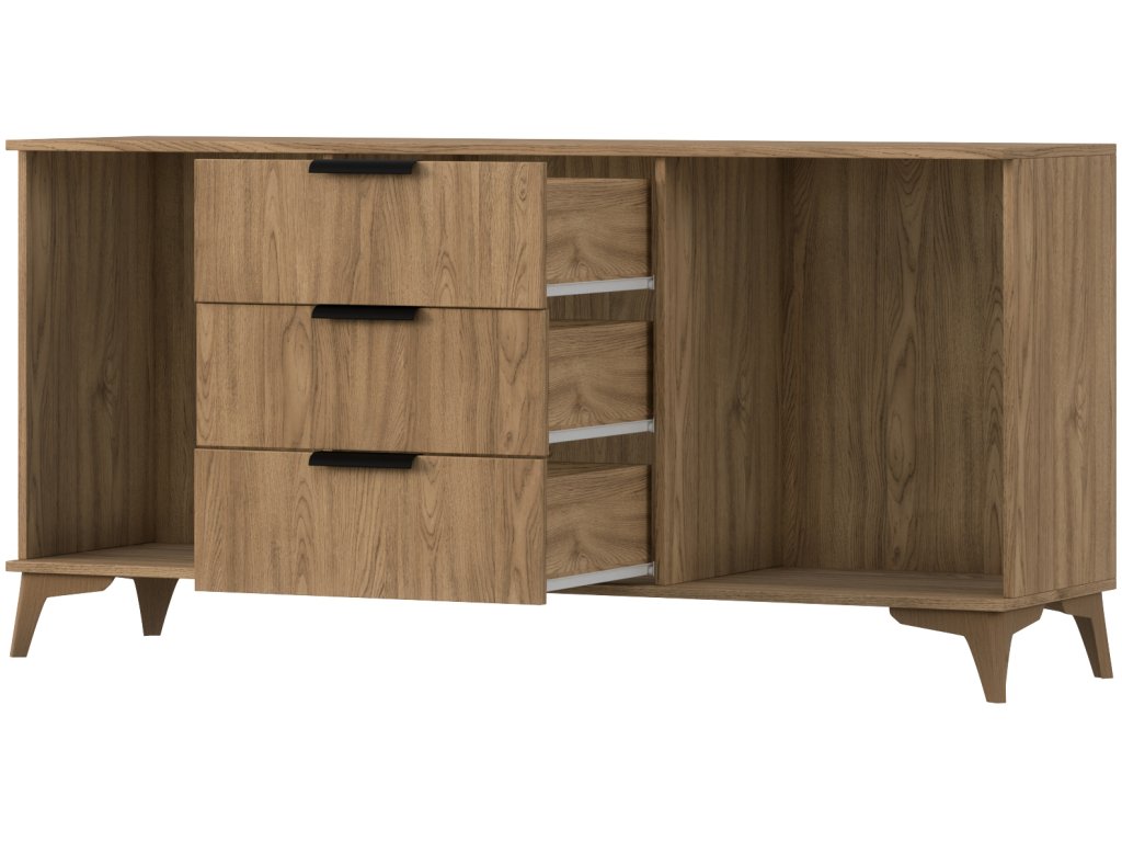 Ta komoda združuje stilski dizajn z največjo funkcionalnostjo, kar jo naredi idealen dodatek za vsak prostor. Ponuja dovolj prostora za shranjevanje s tremi predali in dvema prostornima omaricama, kjer lahko enostavno pospravite vse potrebno. Dekor hrasta artisan doda prostoru topel in prijeten pridih, medtem ko čiste linije in retro nogice poudarjajo njen sodoben videz. Ne glede na to, ali jo uporabite v dnevni sobi, spalnici ali jedilnici, ta komoda prinese vašemu domu ne le eleganco, ampak tudi praktično rešitev za organizacijo vaših stvari.