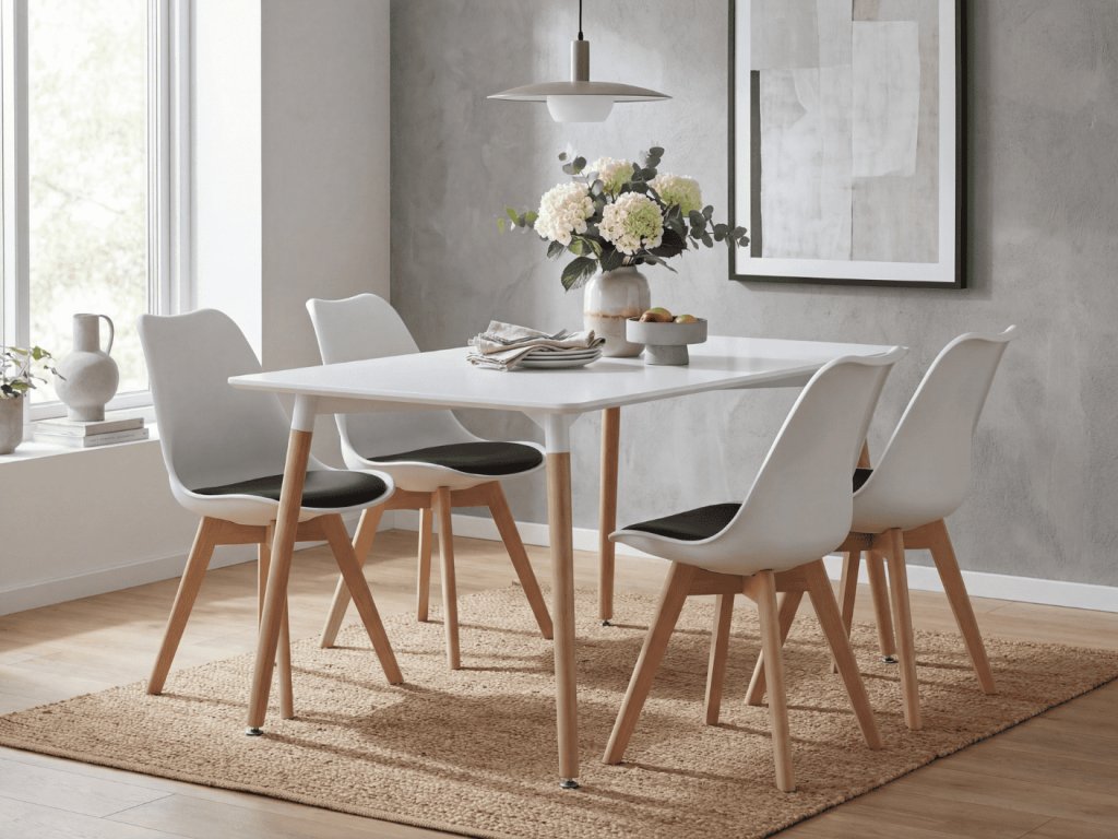 Jedilni set 1 + 4, bela miza ADRIA 120x80 cm + belo-črni stol BALI MARK z bukovimi nogami