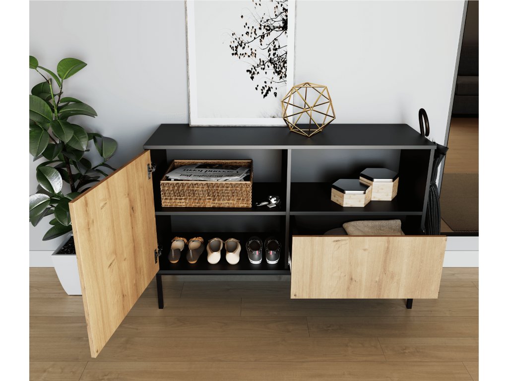 Vnesite stil in funkcionalnost v svoj dom s premišljeno rešitvijo za shranjevanje, ki združuje estetiko in praktičnost. Komoda je odličen eleganten dodatek za dnevno sobo, delovno sobo ali predsobo, njena kombinacija omaric in odprtega prostora pa omogoča poljubno razporeditev dekoracij, knjig ali vsakodnevnih potrebščin. Zaradi čistega dizajna v črnem izvedbenem slogu izstopajo tudi minimalistične dekoracije, sveče ali rastline, ki vnesejo osebni značaj v notranjost. Uporabite vsak prostor maksimalno in ustvarite okolje, ki odraža vaš stil in potrebe.