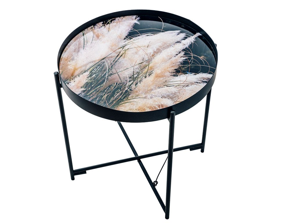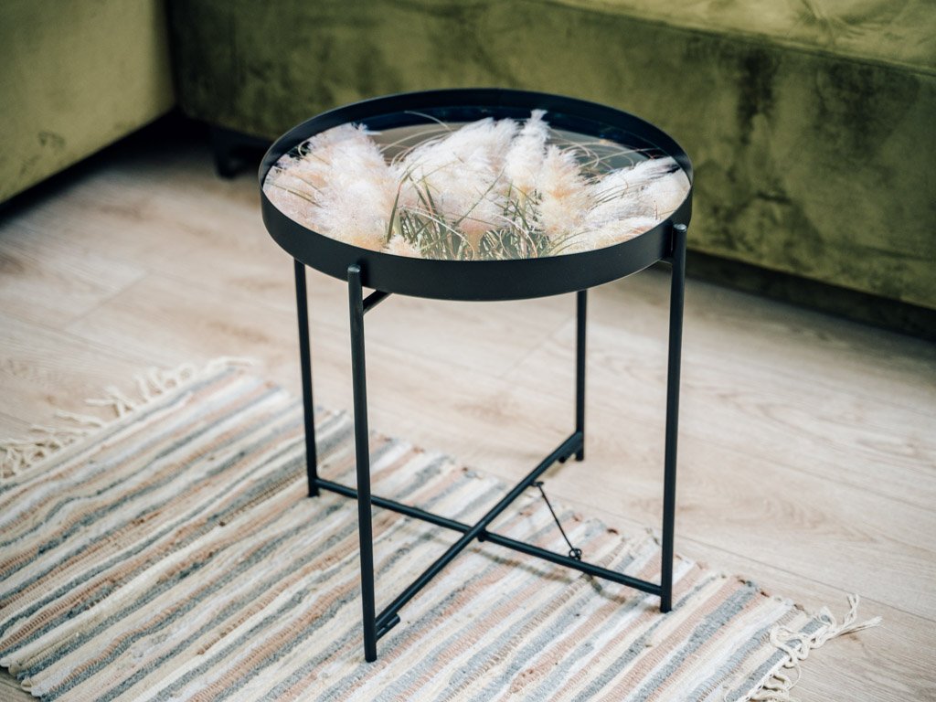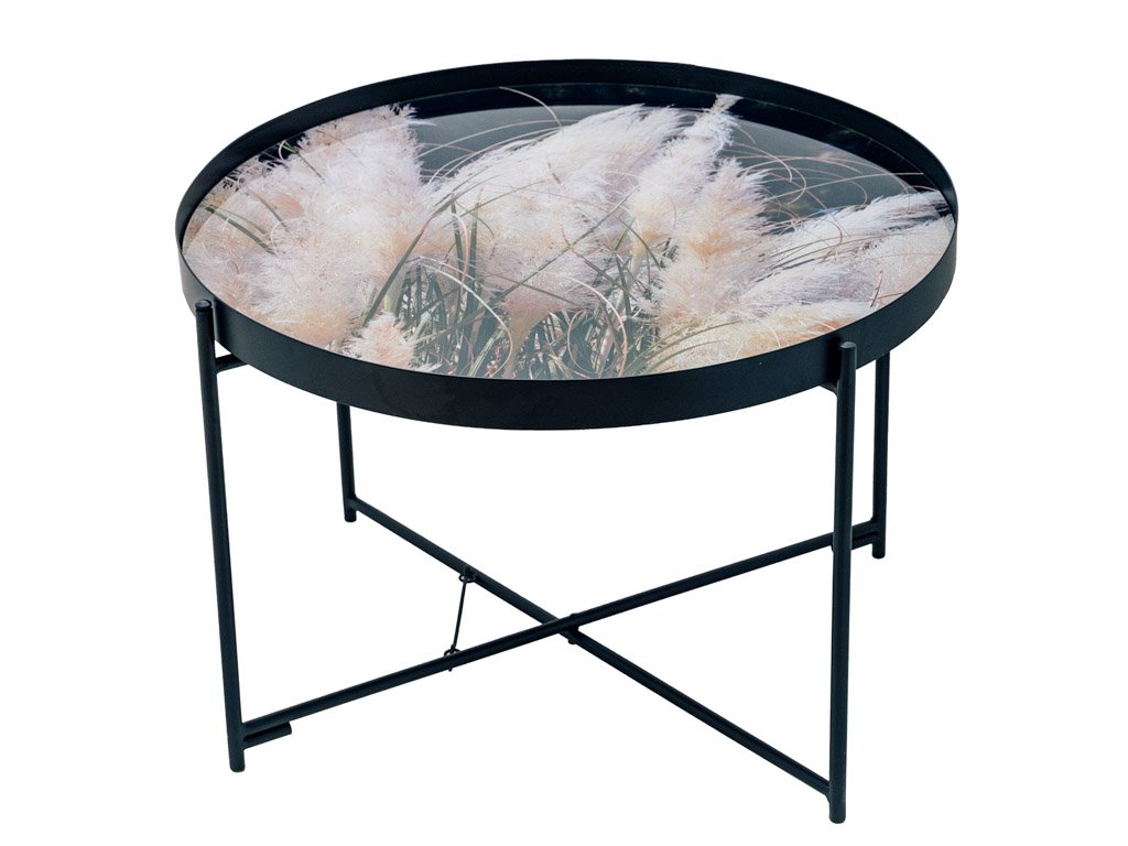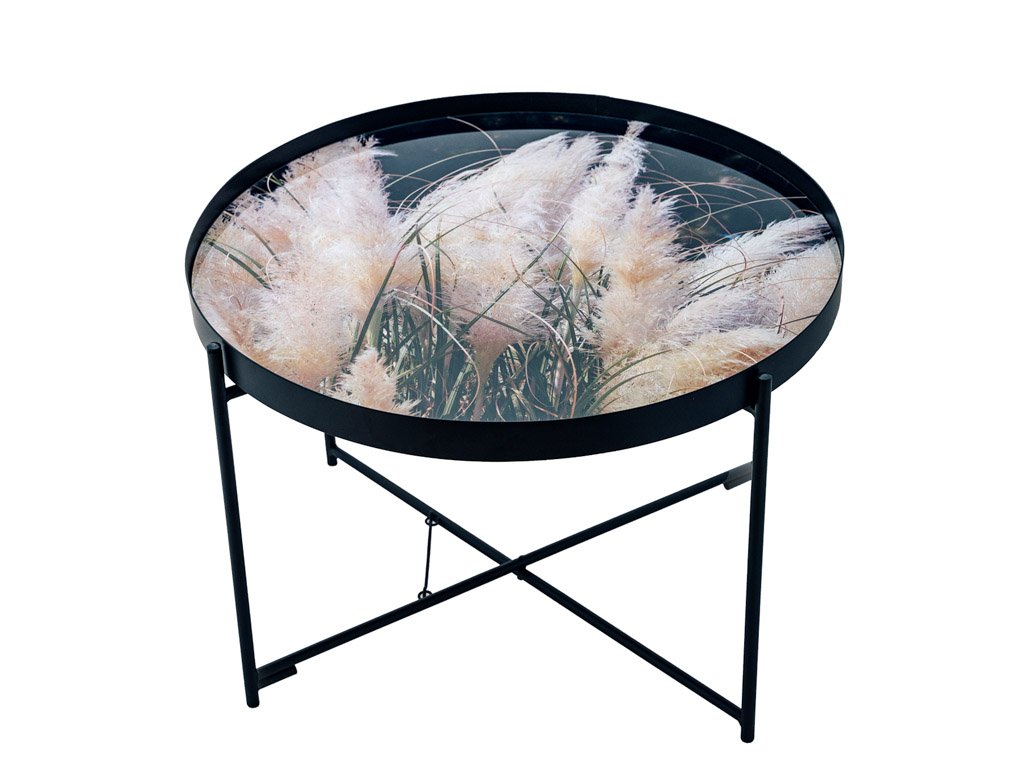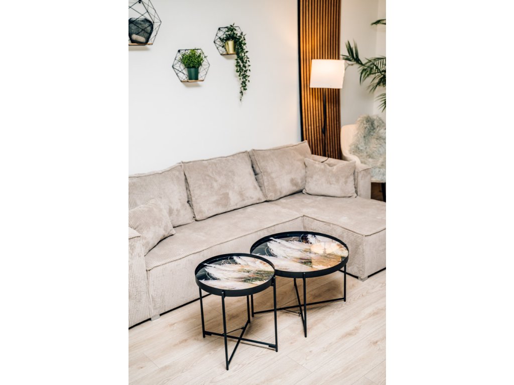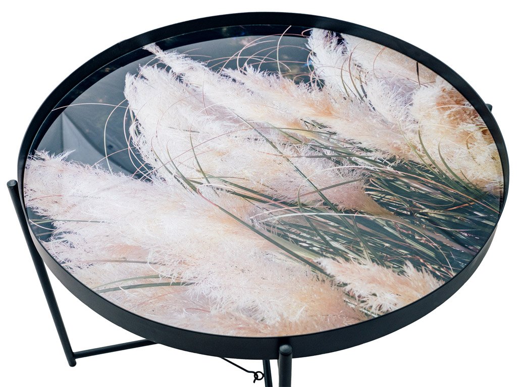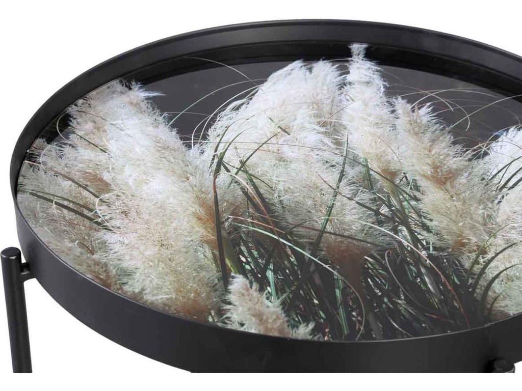 Vzorci okrasnih trav na črnem ozadju, obogateni z nežnimi bež poudarki, ustvarjajo elegantno in harmonično kombinacijo barv. Ta stilski dizajn je idealen za dopolnjevanje sveč, cvetlic in drugih dekoracij, ki še bolj poudarjajo njegovo sofistikacijo. Konferenčna miza LYRIA, črna, postane tako ne le praktičen, ampak tudi izrazit estetski element vsakega interierja.