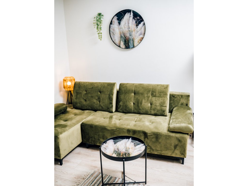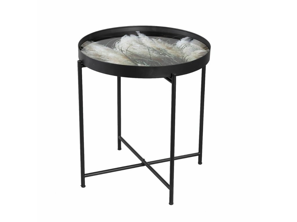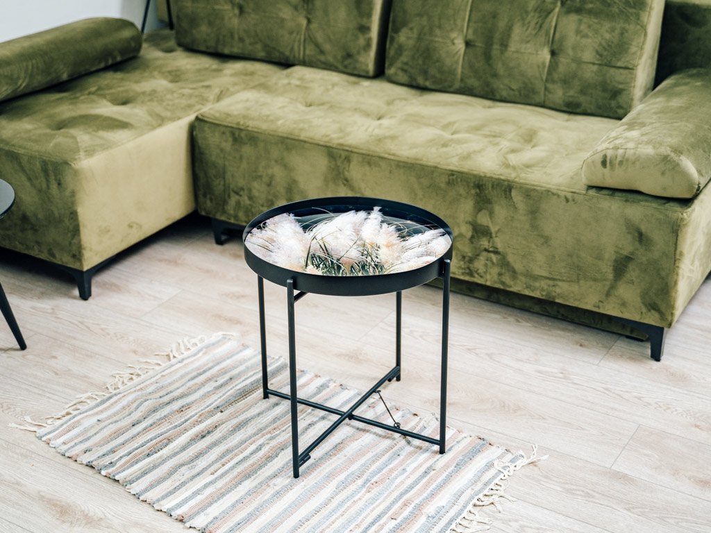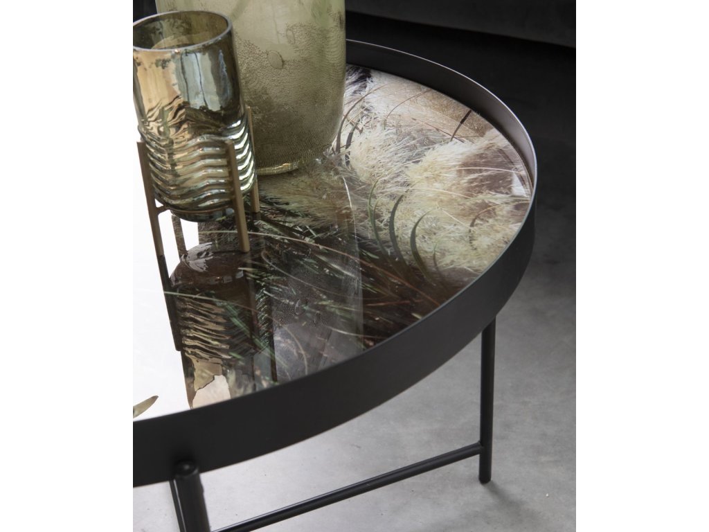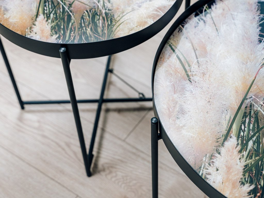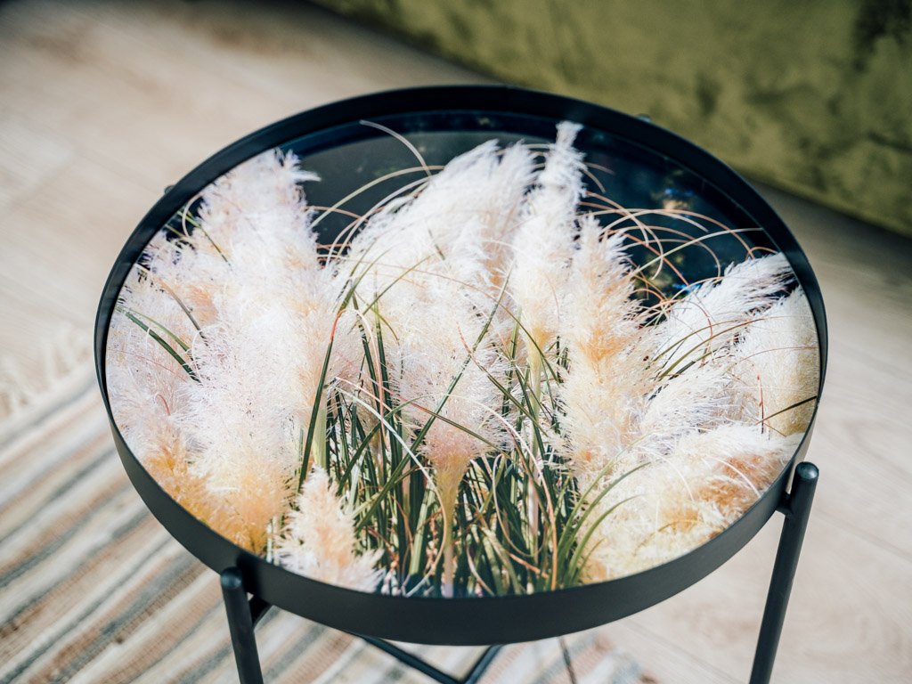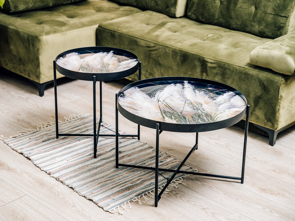Vzorci okrasnih trav na črnem ozadju, obogateni z nežnimi bež poudarki, ustvarjajo elegantno in harmonično kombinacijo barv. Ta stilski dizajn je idealen za dopolnjevanje sveč, cvetlic in drugih dekoracij, ki še bolj poudarjajo njegovo sofistikacijo. Konferenčna miza LYRIA, črna, postane tako ne le praktičen, ampak tudi izrazit estetski element vsakega interierja.