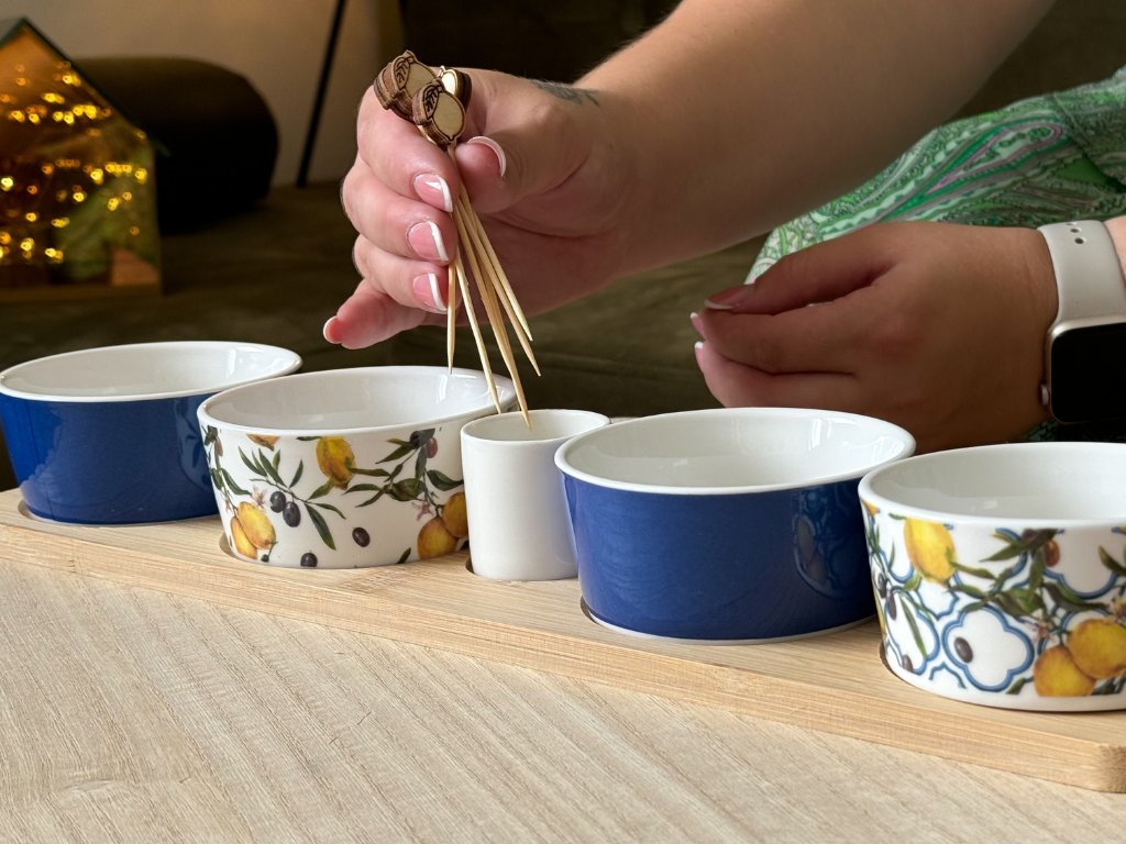 Set porcelanastih tapas skodelic na lesenem podstavku