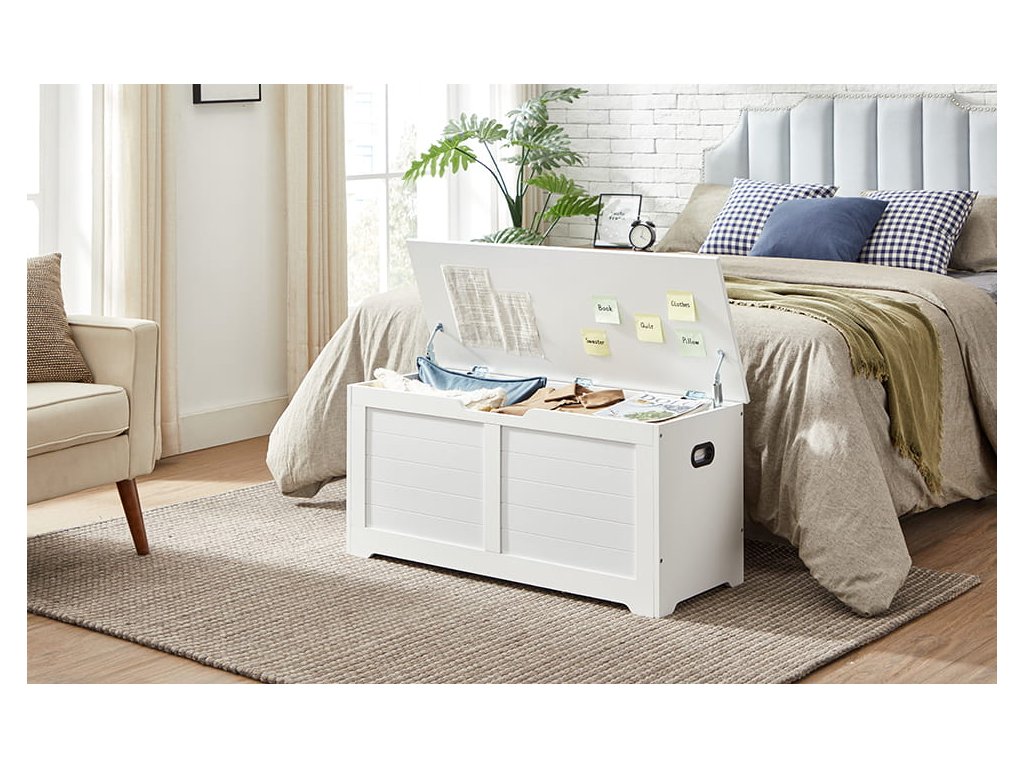 - Pokrov je opremljen s trdnimi tečaji in zavesami, ki držijo skrinjo odprto pod kotom 60 stopinj in manj