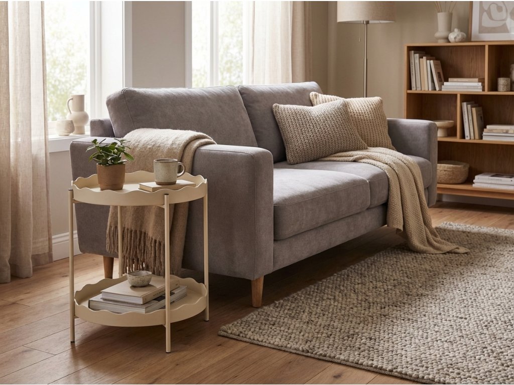 Pomožna mizica RAVELO navduši s svojo preprosto kovinsko izdelavo in izrazitim valovitim robom na obeh odlagalnih površinah. Zaradi premera 40,5 cm in dvonadstropne rešitve nudi dovolj prostora za odlaganje, ne da bi zasedala veliko prostora. Primerna je ob kavču, v spalnici ali predsobi. Njena nežna barva in čist dizajn omogočata preprosto kombiniranje z naravnimi materiali, pastelnih tonov ter skandinavskim ali modernim stilom.