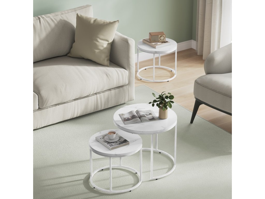 Priskrbite si praktičen in eleganten dodatek za vaš interier. Set okroglih mizic z marmor dekorjem in belo kovinsko konstrukcijo prinaša zračnost in slog v vsak prostor. Zaradi različnih velikosti jih lahko enostavno prilagodite prostoru in potrebam – manjšo mizico lahko deloma vstavite pod večjo, s čimer prihranite prostor. Idealne so za odlaganje knjig, skodelice kave ali dekoracij. Primerne so ne le za dnevno sobo, temveč tudi za domačo pisarno, spalnico ali pokrito teraso. Odkrijte čar preprostega in funkcionalnega dizajna, ki ga boste vzljubili.