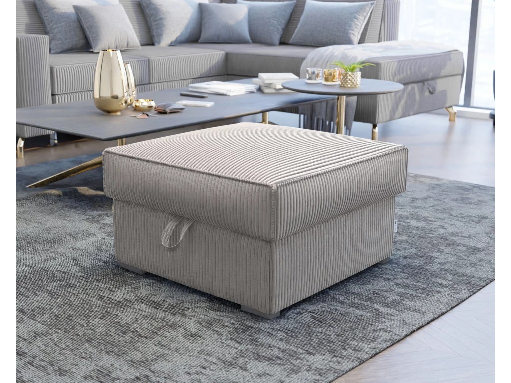 Tabure je prevlečen s tkanino Poso z nežno rebrasto teksturo, zelo prijetno na dotik, z visoko gramatico 380g/m2 in odpornostjo proti obrabi. Konstrukcija tabureja je izdelana iz trdne pohištvene plošče, dopolnjene z masivnim lesom. Sedež sestavlja penečno polnilo, ki zagotavlja udobno sedenje.