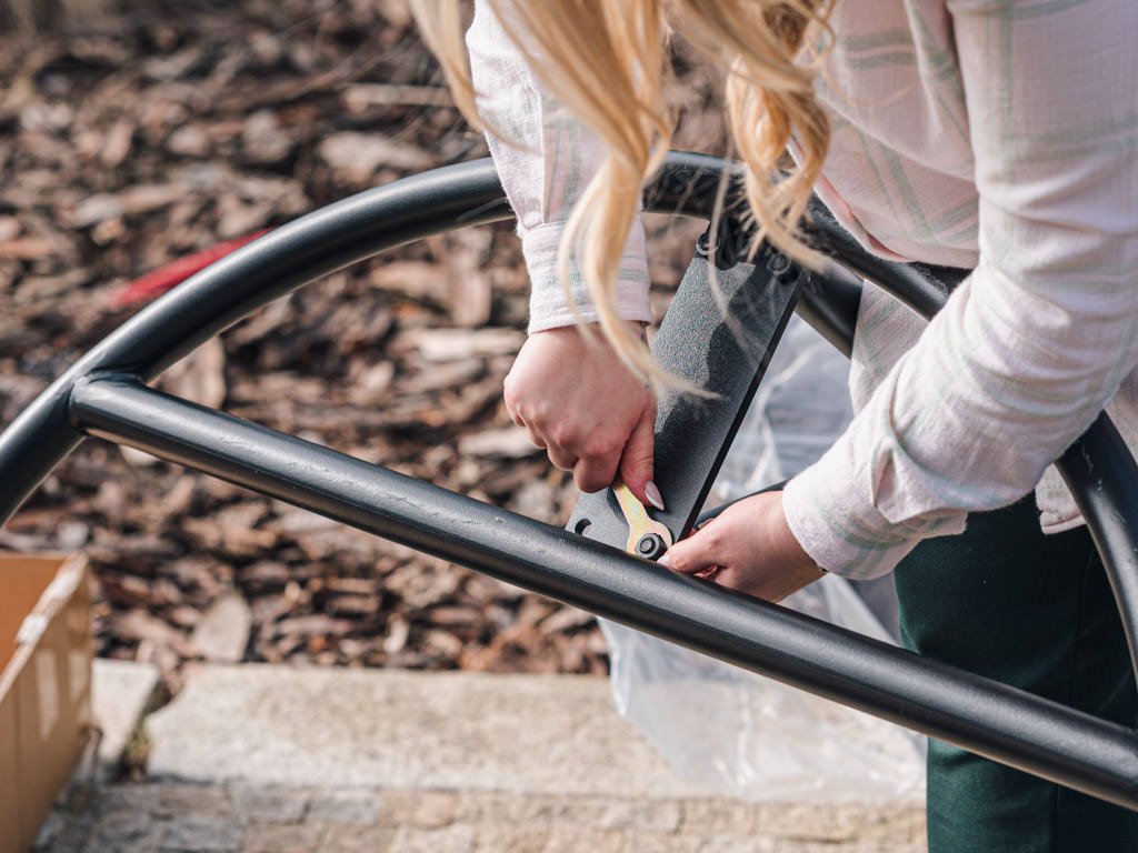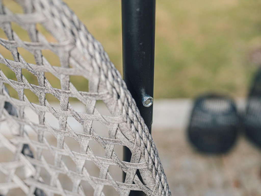 - Če uporabljate stojalo za obešanje stola, ga postavite na ravno in trdno površino, kjer bo njegov položaj stabilen (npr. tla, tlakovana terasa).