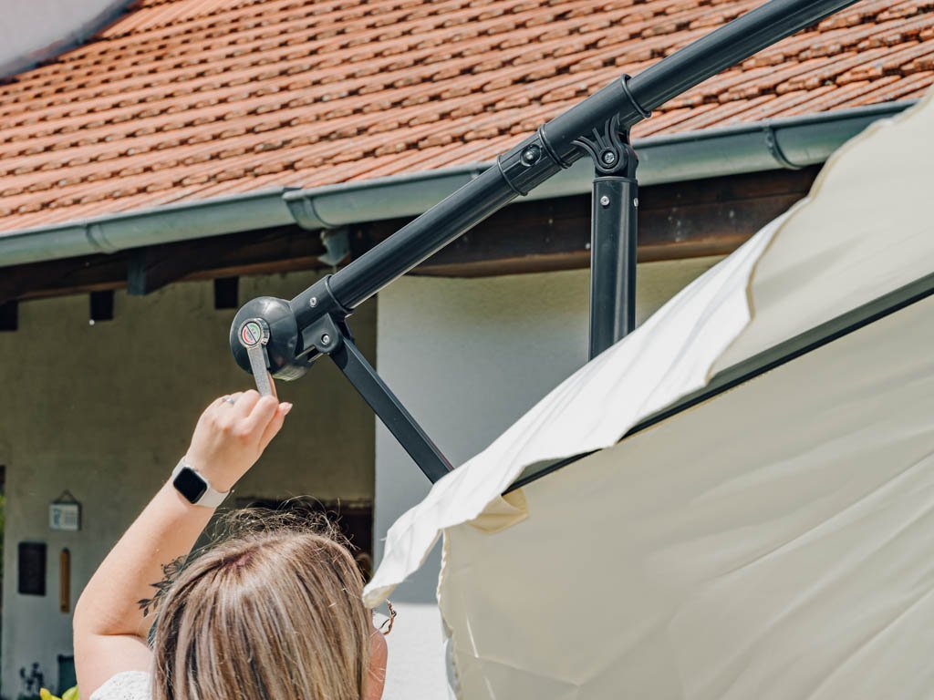 Senčnika ne pustite razgrnjenega ob neugodnih vremenskih razmerah. Med zelo močnim vetrom priporočamo, da senčnik zložite, da preprečite njegovo poškodbo.