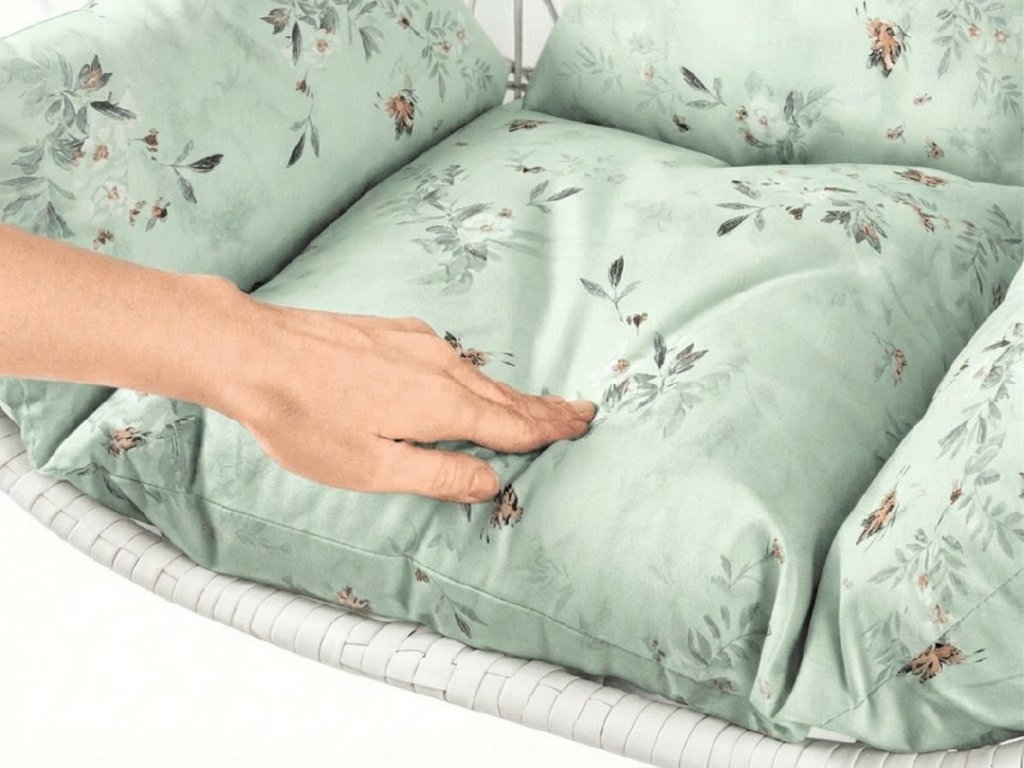 Beli viseči stol KOKON s stojalom, svetlo zelena blazina z vzorcem